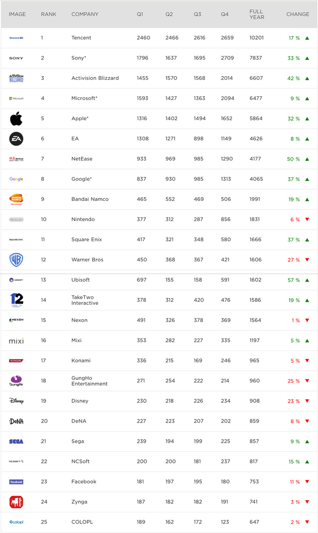纯粹的大型移动游戏公司(比如Gree、Gung-Ho、Mixi)表现并不是最好的,这点倒是比较有趣。表现最好的是传统游戏企业,比如Take-Two、Square Enix、Ubisoft。去年,索尼和动视暴雪是排名第2和第3的游戏公司,营收分别为78亿美元和66亿美元。
