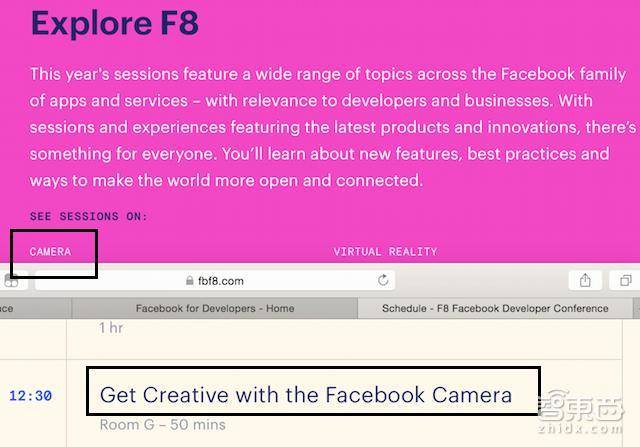 在F8大会开始前,我们可以在官网上看到如下信息:1、本次F8的内容涵盖相机、VR、Messenger等,其中“相机(Camera)”是摆在第一位的;2、在最重磅的开场演讲之后,第一个展示分享环节的名子就叫做“用Facebook相机发挥你的想象力(Get Creative with the Facebook Camera)”