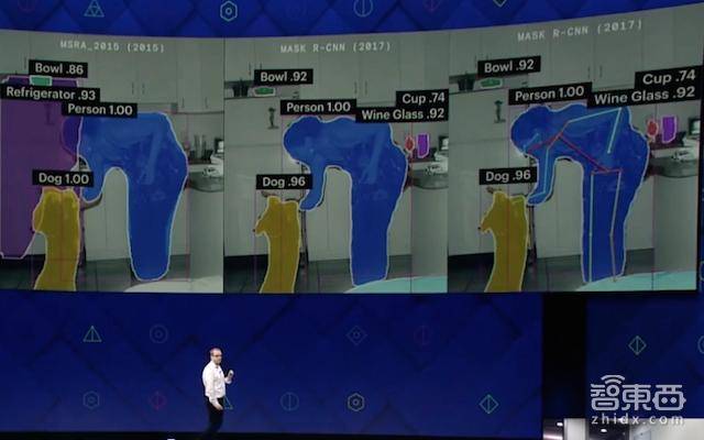 能做到这几点,少不了人工智能的强力加码,会上Facebook CTO Mike Schroepfer专门提到了Facebook人工智能研究院的院长、深度学习三巨头之一Yann LeCun教授在DeepMask图像检测、分割、识别等技术上的研究。另外,Mike Schroepfer还提到,现在Facebook不仅能够分割出,还能够生成人类3D骨架主架构(如图)。