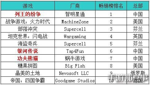 根据App Annie 7月份发布的公司和APP收入排行数据中,惊喜地发现中国厂商和游戏已经在俄罗斯成绩傲人。在公司排行榜上,中国发行商智明星通、Tap4Fun和IGG7月收入均进Top10。在应用排行上,9款游戏中中国游戏占4款。《列王的纷争》较上月上升2个名次,成功登顶;《银河传说》和《城堡争霸》收入与上月持平,分别名列第5位和第6位;《英雄指令》下降了2个名次,排在第9位。