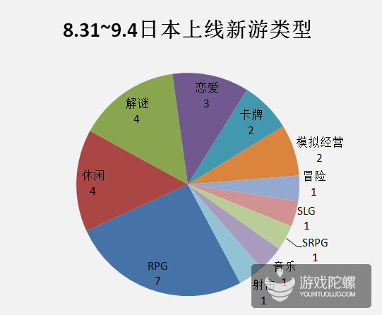 上周一共上架27款新游,从类型上来看,RPG最多,占7款。休闲和解谜各4款,恋爱3款,卡牌、模拟经营各2款,冒险、SLG、SRPG、音乐、射击各1款。较以往不同的是,上周休闲类手游稍有减少,而解谜类型的手游有所增加。
