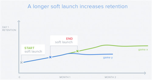 游戏分析公司deltaDNA对几千款手游做了研究,发现“软发布”持续时间的长短对留存有影响: