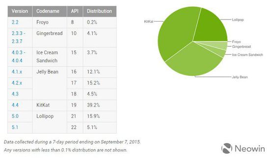 上个月,Google透露Android 5.x Lollipop在已激活Android设备中的占用率已经达到了18.1%。该数字在最近几周进一步增长,但仍然远不及追赶它的前身——Android KitKat。Google最新的官方数据显示,9月首周,Android 5.0从上月的15.5%,增长到了15.9%;Android 5.1增长了近一倍,从2.6%增加到了5.1%——综上,Android Lollipop总份额已达21%。