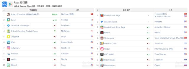 图注:App Annie 2017年11月iOS & Google Play合并APP下载和收入排行榜