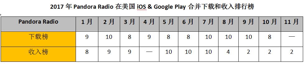Pandora 自 2011 年 12 月 2 日首次登顶美国音乐类APP畅销榜至今,大多数时间占据美国音乐类 APP 畅销榜前三位,其中绝大多数时间称霸畅销榜榜首。据 App Annie 发布的 11 月 IOS & Google Play 合并 APP 排行榜显示,Pandora Radio 力压众多游戏和视频软件,位列 APP 总收入榜第二名。