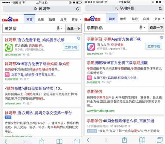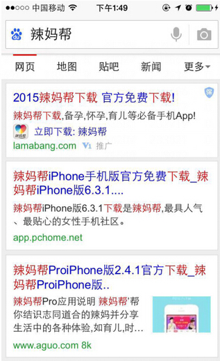 近期碰到一个客户辣妈帮,刚获得上亿美金融资,热词搜索度也很不错。盛名之下,旗下的两个APP辣妈帮和孕期伴侣都遭到了竞争对手的品牌词优化(业内人士一眼就能看明白,用户关键词搜索下载辣妈帮,显示的也是辣妈帮,但下载到手机上的就成了妈妈帮了)。对于无线app来说,这相当于自家的流量直接被别人给非法截取,自身很难在该渠道获取流量。