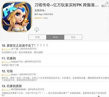 从另一方面来说,评论的价值又是非常重要,最近关于一些游戏从榜单消失、甚至下架的新闻,其根源在于苹果商店对评论的严格把控。对游戏的运营商而言,评论的重要性也显而易见。如果一个游戏的差评比较靠前又比较多,那么通过点击广告或者榜单而来到游戏下载页面的玩家,看到大量差评以后,说不定会望而却步。而对于游戏的开发者而言,因为玩家直接和游戏官方沟通的难度比端游时代要难得多,所以苹果商店的用户评论在某种程度上也承担了“向开发组提交bug和建议”的作用。