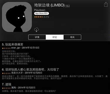 一些风格独特的解谜游戏也是差评的重灾区。有一部分玩家在《地狱边境》的差评里说:“这游戏太难了……太可怕了……它给我带来了精神伤害!”——毕竟这款游戏是付费后才能玩的。