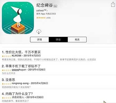《纪念碑谷》的差评和《地狱边境》刚好形成有趣的对比:“这游戏怎么这么简单……而且,怎么又降价了!你这让我们这些花高价买游戏的人情何以堪!”