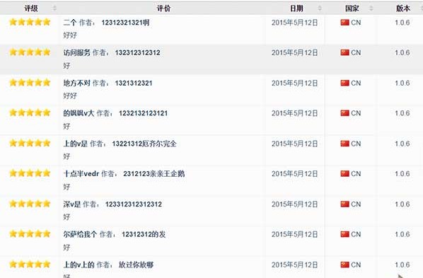 在苹果的榜单上来说,比起无脑的喷子来说,更可怕的是无脑点赞,甚至是捧杀。比方说由网易代理的《魔天记》,在5月17日的时候被App Store进行了下榜处理。我们猜测游戏下榜的原因是因为游戏有刷评论的嫌疑:在评论区,出现了大量意义不明重复明显的五星好评,评论者的ID和标题仿佛脸滚键盘,内容通常只有“好”或者“好好”两个字。这些评论集中出现在5月12日当天,致使这一天的评论数比前一天和后一天分别高出了数倍和数百倍。