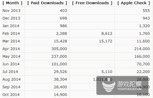 2013年11月-2014年10月,《小黑屋》iOS版本每月下载量及苹果公司的分成金额