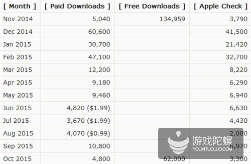 2014年11月-2015年10月,《小黑屋》iOS版本每月下载量及苹果公司的分成金额