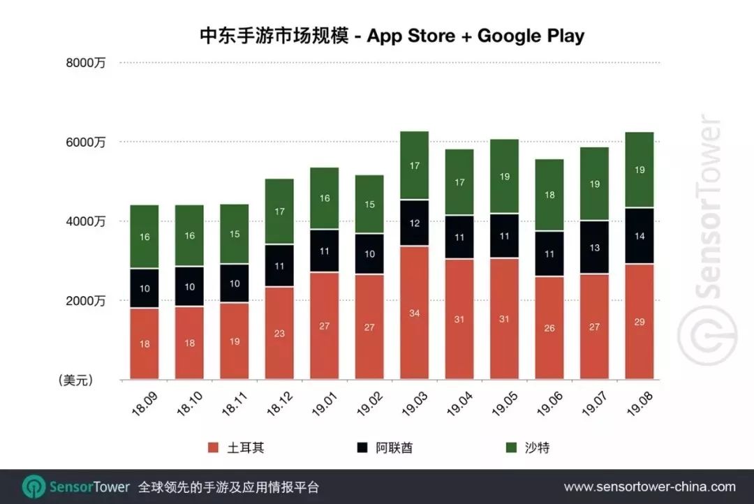 Sensor Tower 数据显示,过去一年土耳其,阿联酋和沙特手游市场仍处于快速发展阶段。2019 年 8 月三个市场手游总收入达到 6200 万美元,较 2018 年 9 月 4400 万美元上涨 40.9%。