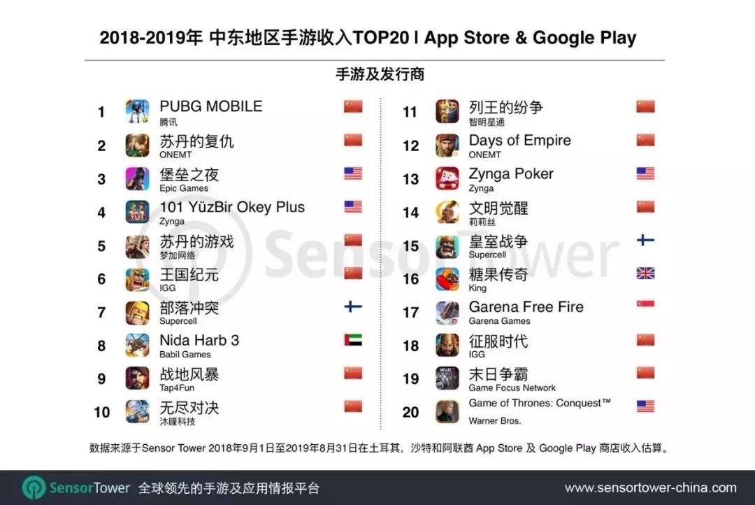 从游戏分类来看,收入榜 Top20 中,SLG 手游多达 13 款,战术竞技手游 3 款,卡牌游戏 2 款,MOBA 和休闲游戏各 1 款。中东市场成为 SLG 手游的必争之地,其中本地化程度最高的《苏丹的复仇》收入最高,位列榜单第 2 名。