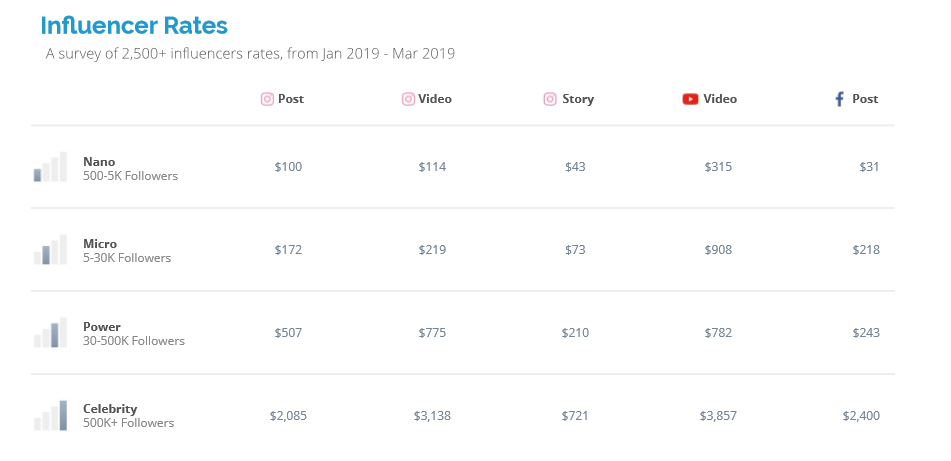 比如,拥有 30 到 50 万关注者的 Kol,每个 instagram 帖子可获得 507 美元,每个 YouTube 视频可获得 782 美元;拥有 50 万以上关注者的 Kol,每个 instagram 帖子收入 2000 美元,每个 YouTube 视频收入约 3857 美元。