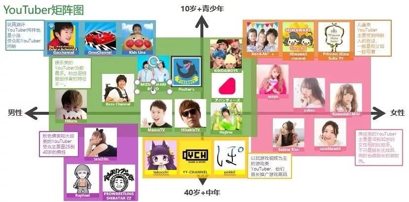 横轴是性别,左边是男性右边是女性;纵轴是年龄,上面是年轻人,下面的是四五十岁的中年人。上面部分的 YouTuber 会更偏向年轻受众,比如天蓝色的这个部分,上面是几个孩子,他们就更适合十岁左右的青少年观看,这些 YouTuber 就会在自己的视频里介绍自己喜欢的玩具,最近好玩的赛车等等,通常孩子和家长一起看这种内容多一些。