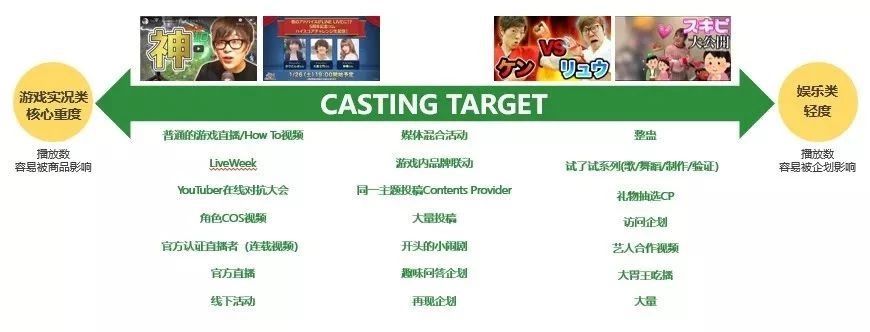 看一下上面这张图,左边箭头是指一些比较深度的玩法,比如在视频里深度剖析游戏等等;右边是比较轻度娱乐的,内容通常是一开始整个视频的前半段,通过很好玩的趣味内容去吸引观众,后面再把游戏的推广放出,召唤观众们进行下载。