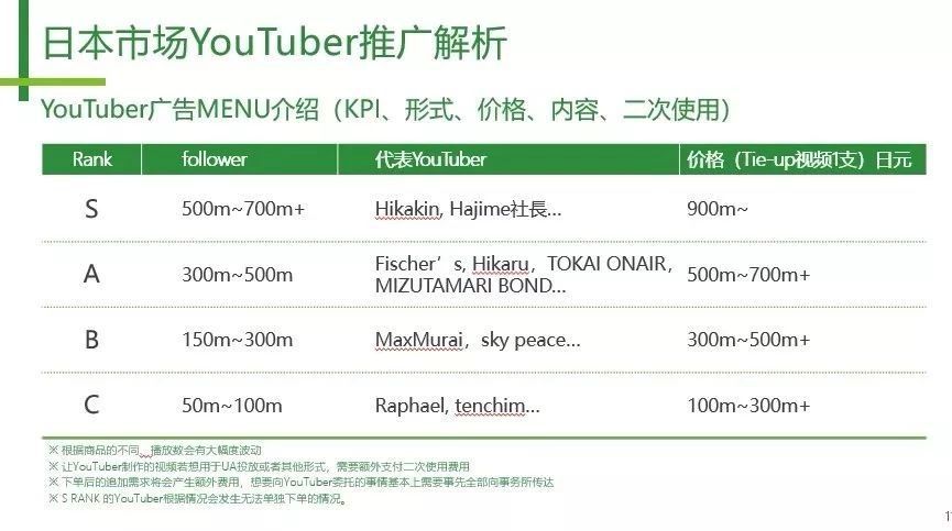 S 级的包括我们刚才说的 Hikakin 以及 Hajime 社长为代表,他们同属于 Uuum 这个事务所,和这家事务所合作,如果买大咖位的 YouTuber 内容推广还要附带买小咖位的 YouTuber,因为他们在业内占了比较领先的位置,沟通难度不小,这也是为什么我们推荐和 YouTuber 合作要走代理的原因,因为代理公司能在这方面减少麻烦。