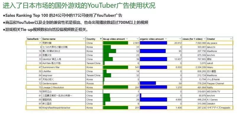 上面是日本目前畅销前 100 的游戏,包括中国、韩国等外来发行商的产品在内,其中共有 24 款是海外游戏,这其中有 17 款(三分之二)都是、做过 YouTuber 平台的 tie-up。我们可以看到 YouTuber 这种推广方式和商品的兼容性非常高,当你游戏和视频内容联系比较紧密的时候,就会产生非常高的播放量。例如《荒野行动》给 YouTuber 付费做视频,在 YouTube 平台有 2000 多条,然后自然产生的 YouTube 视频是 20000 多条。值得一提的是,为《荒野行动》做视频 sky peace 只是个 B 级 YouTuber,但他做的视频播放量居然达到了 700w,即使是一般 S 级的 YouTuber 做视频,能有 100 万到 200 万播放量就已经算效果很好了。为什么能到 700 万播放量?这是因为 sky peace 给《荒野行动》做了一个主题曲,然后很魔性和洗脑,传播非常好,因为他本来就是经常会给商品唱主题曲的一位 YouTuber,所以最终取得的效果非常拔群,性价比也很高。