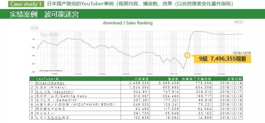下面再给大家介绍两个 case study,一个是日本的游戏一个是我们中国的游戏。日本这款游戏叫《波可龙迷宫》,是 2016 年 12 月上市的,那时候这款游戏的排名是 300 名开外,通过 12 月份时候与 9 组 YouTuber 的合作,以和《街头霸王》的 IP 联动为核心做了 YouTuber 推广,而后排名上直接飙升到了第 7,其视频整体播放量超过了 700 万。