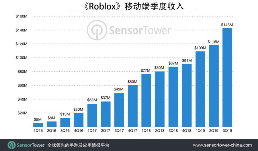 2018 年,《Roblox》移动端的总收入为 3.35 亿美元,较 2016 年 4570 万美元的收入增长了 6 倍。2019 年至今,《Roblox》移动端收入达到 4.35 亿美元,已经比 2018 全年收入增长了 30%。截至目前,该游戏收入最高的月份是 2019 年 8 月,全球收入达到 5000 万美元,当月《Roblox》举办了第 5 届开发者大会。作为 App Store 和 Google Play 的畅销手游之一,《Roblox》从 2018 年一直稳居美国手游畅销榜 Top10,且在过去 3 个季度跻身 Top5。