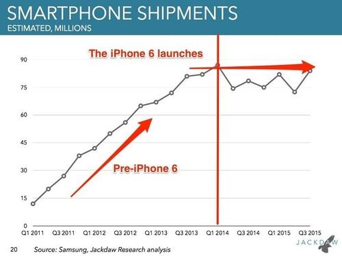 以下就是 Jackdaw Research 发布的数据统计图,苹果进入大屏幕智能手机市场之后到底发生了什么,我们只要看看这两张图片就明白了。三星的手机销量可以分成两个阶段,“iPhone 6 发布前”和“iPhone 6 发布后”。