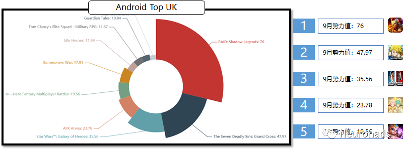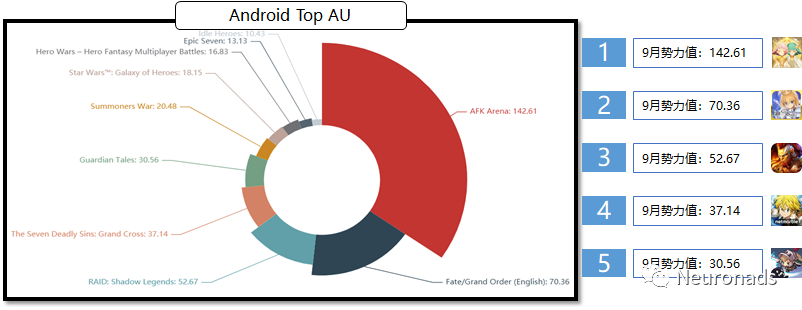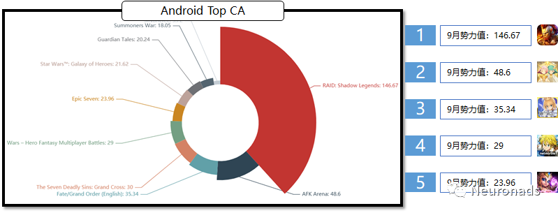 在英美澳加德法俄中东这么广泛的区域内,玩家对卡牌 RPG 的口味是颇为一致的,对硬核写实风格与卡通风格均能接受。RAID:Shadow Legends、Hero Wars、Guardian Tales、AFK Arena、Summoners War,这几款产品反复出现,各个市场都在前列。反而是依赖 IP 的作品地域性很强,例如星战就只在英美能排最前列,在亚洲很高的 FGO,德法俄看不到其身影。