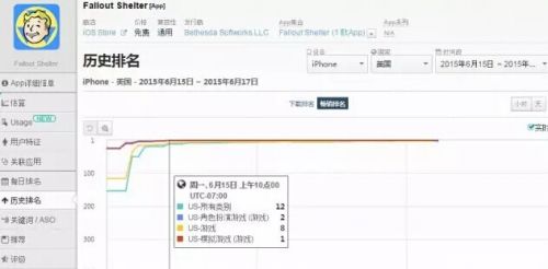 在美国时间6月14日举行的E3展前发布会上,B社在发布主机游戏《辐射4》之前,手游《辐射:避难所》(Fallout Shelter)就已上架App Store,而从App annie的欧美iOS榜单数据来看,《辐射:避难所》于北京时间6月15日凌晨0点上架,随后的上午10点冲上畅销榜第8,用时不到半天。而短短两天内,又一举拿下欧美包括美国、英国、德国、澳大利亚等40多个国家免费游戏榜第1,并杀入多国畅销榜Top5,37小时后排在美国畅销榜第3的位置,超过了King的《糖果粉碎传奇》。