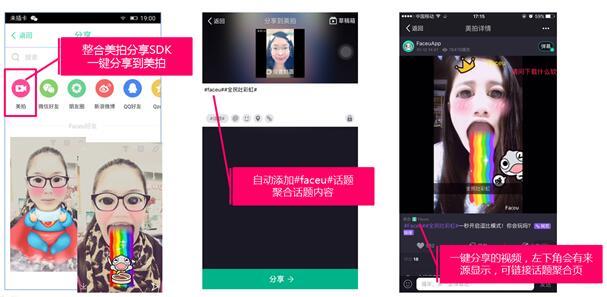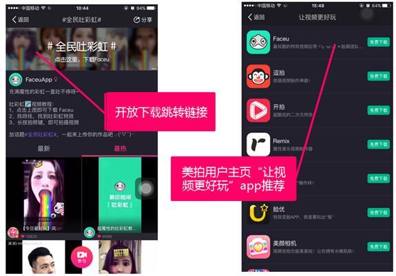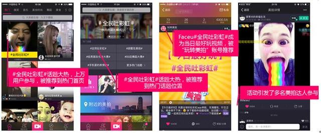 1月8日,Faceu双平台完成接入美拍开放平台,用户可以轻松地将制作好的视频文件一键分享到美拍,并且可以在美拍视频左下角中显示视频来源。1月15日,Faceu在美拍举办了一个名为#全民吐彩虹#的互动活动,邀请用户点击下载Faceu,录制一段“吐彩虹”的视频,然后分享到美拍参与活动。此外,美拍为Faceu的活动页开放了站内直接跳转下载Faceu的权限,保证活动的流畅性,还将活动加入热门信息进行推广,并给予一系列资源协助,比如在美拍应用内进行app推荐、活动推荐等。一时间,美拍满屏都是彩虹。