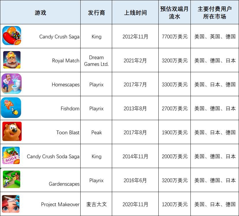 海外头部休闲三消产品一览 | 数据来源:白鲸研究院
