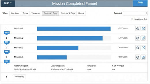 游戏分析的难点之一,是确保将在游戏中处于类似阶段的玩家进行对比——比较新手玩家与老玩家的用户行为意义不大。在移动平台,开发者可以将游戏内进度相当的玩家进行归类,通常来说,我们将完成特定关卡的玩家划入同一类别。