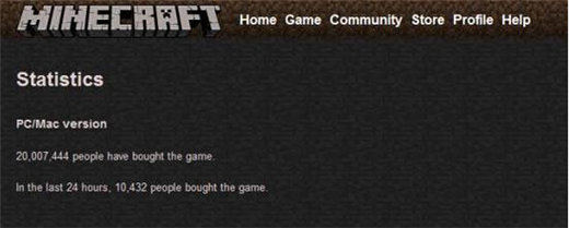 游戏开发商Mojang在其官方网站上宣布热门游戏《Minecraft》(我的世界)在PC端销量突破2000万份,而在刚刚过去的24小时内销量为10364份,这也使这款热门游戏在各平台的销量总和超过7000万份。