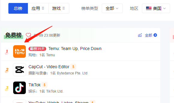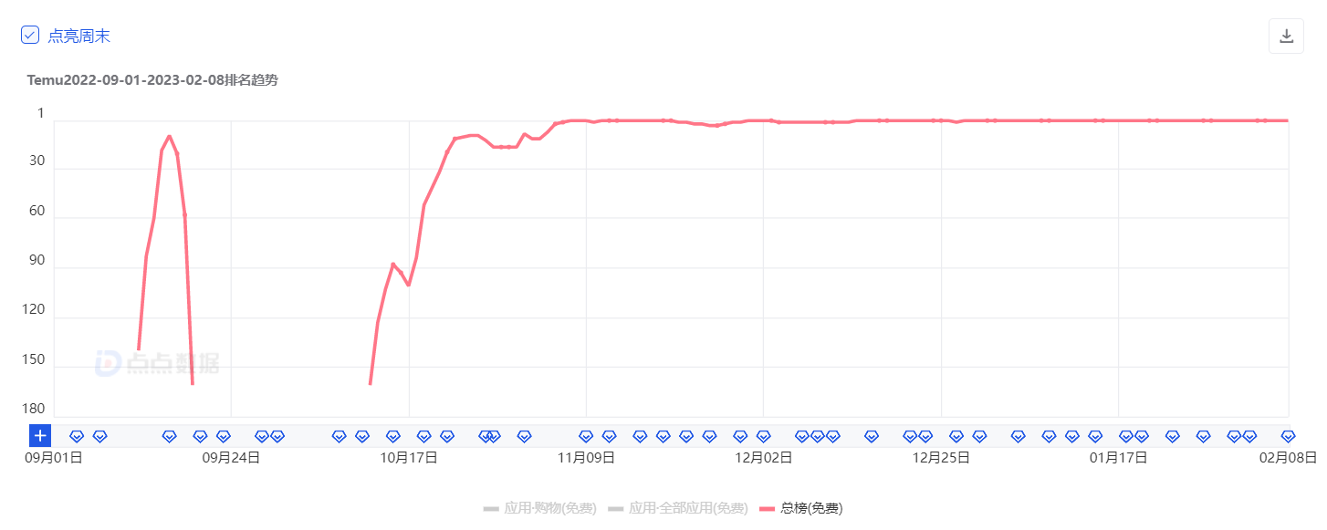 Temu 自上线以来 iOS 免费榜成绩 | 来源:点点数据