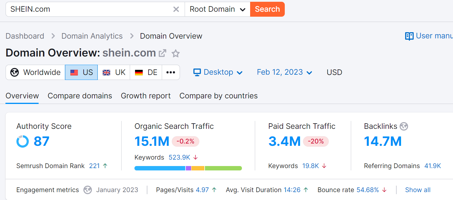 相较之下,Temu 网站端的流量小了很多。Semrush 显示,Temu 的网站端 2 月 12 日自然流量大约在 21.4 万,付费流量 4 万。付费流量占比,其实在一定程度上也和上面 Google Trends 的数据能对的上 。虽然绝对值相差很多,但现在 SHEIN 的自然流量和付费占比,差不多也是 5:1。