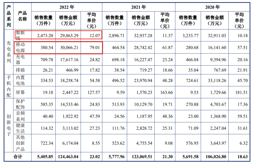 这几年来,品胜的数据线卖得很好,2020 年达到了高峰,卖出了 3233 万件,随后持续下降,但依然有很大的体量,2022 年还保持了 2473 万条,售价也上升到了 12.07 元。