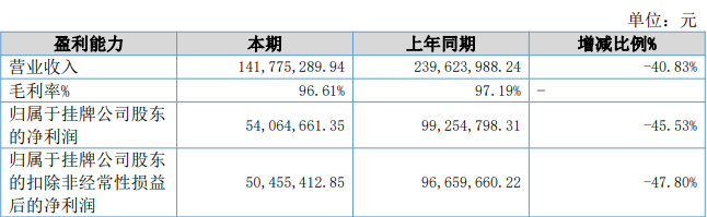 财报显示,公司 2023 上半年营收约 1.42 亿元,同比下降 40.8%;归母净利润为 5406 万元,同比下降 45.5%;扣非净利润为 5046 万元,同比下降 47.8%。