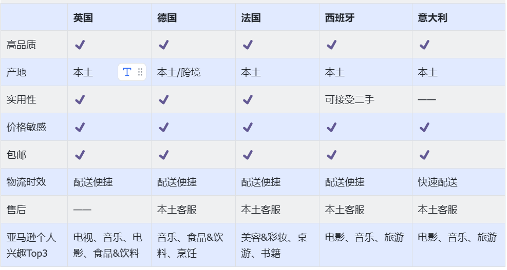 亚马逊对 2022 年英国、德国、法国、西班牙、意大利这 5 个国家市场消费数据进行了研究,发现不同国家市场之间,存在一些普遍共性,例如,消费者普遍偏好高品质商品;对方便实用、节省时间的产品感兴趣;注重价格;更偏好购买方便、配送便捷的购物体验等等。