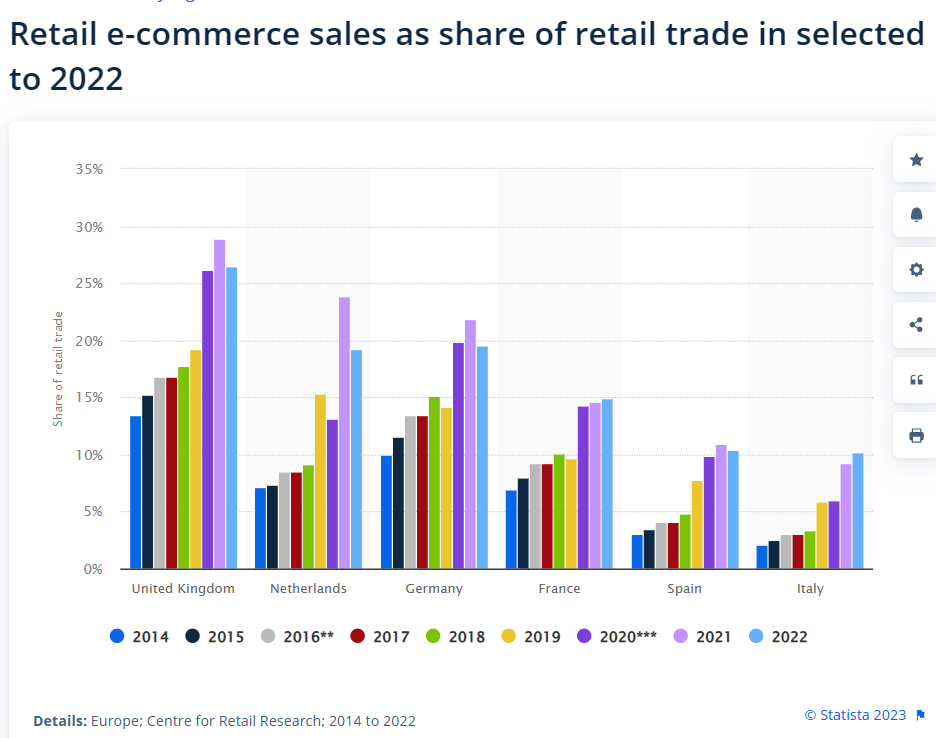 表2. 2014-2022年,英、荷、德、法、西、意欧洲六国电商零售额占本国零售交易总额比例 | 来源:Statista