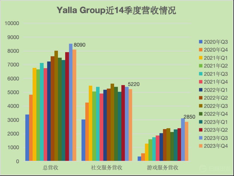 根据财报数据,2023 年 Q4 营收 8090 万美元,同比增长 7.7%,环比下降 5%。其中社交营收 5220 万美元、游戏营收 2850 万美元。