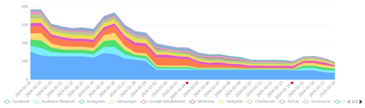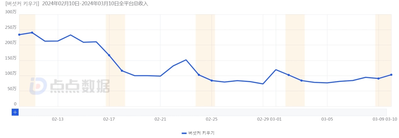 此前游戏出海营收最高的韩国市场日流水已经从超过 180 万美元下滑到 60 万美元,只剩下了 1/3。而日本市场虽然在 2 月 22 日起量后日流水迅速上涨到 192 万美元的峰值,但随后也迅速下滑,从 3 月 8 日开始下降到 70 万美元以下。在不同市场流水都大幅下降,「菇勇者传说」维持流水高位的能力大概率不如其他头部出海产品。