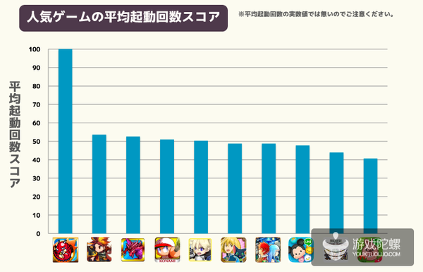 接下来将10款游戏的平均启动次数进行了指数化,平均启动指数是以10款游戏中平均启动次数最高的游戏=指数100为基准进行计算,也就是说《怪物弹珠》是其中平均启动指数最高=100,其他依照此基准对比算出。具体数值如下图所示: