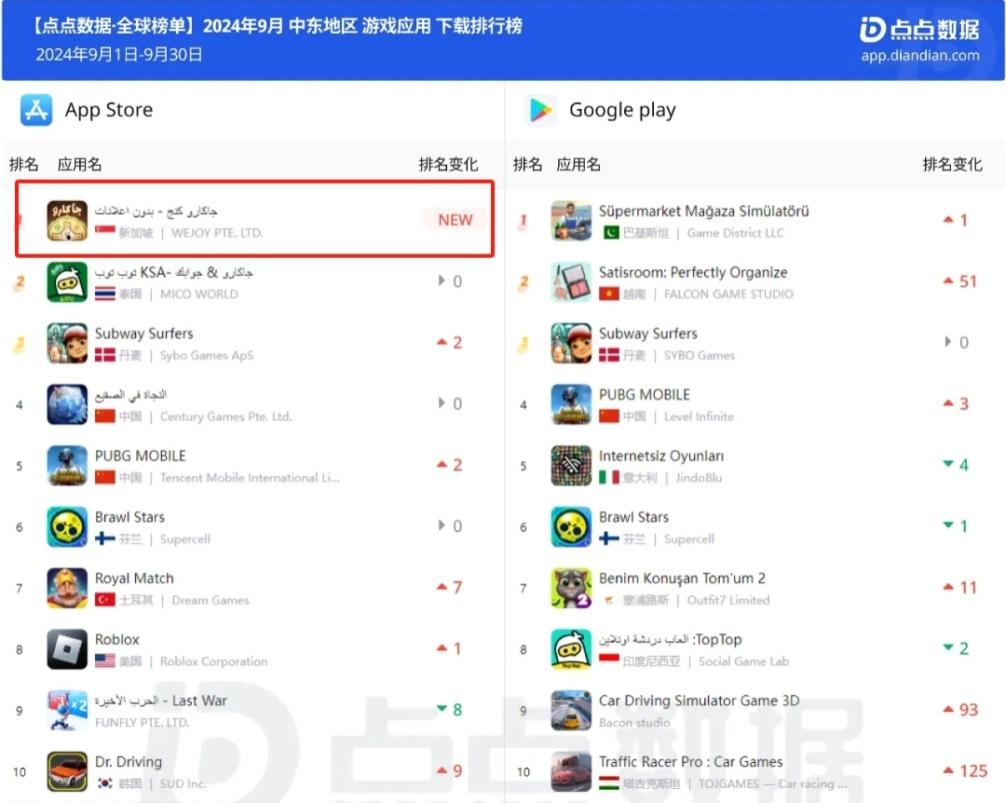微派网络发行的「Jackaroo King」登顶 2024 年 9 月中东 iOS 手游下载榜 | 图片来源:点点数据