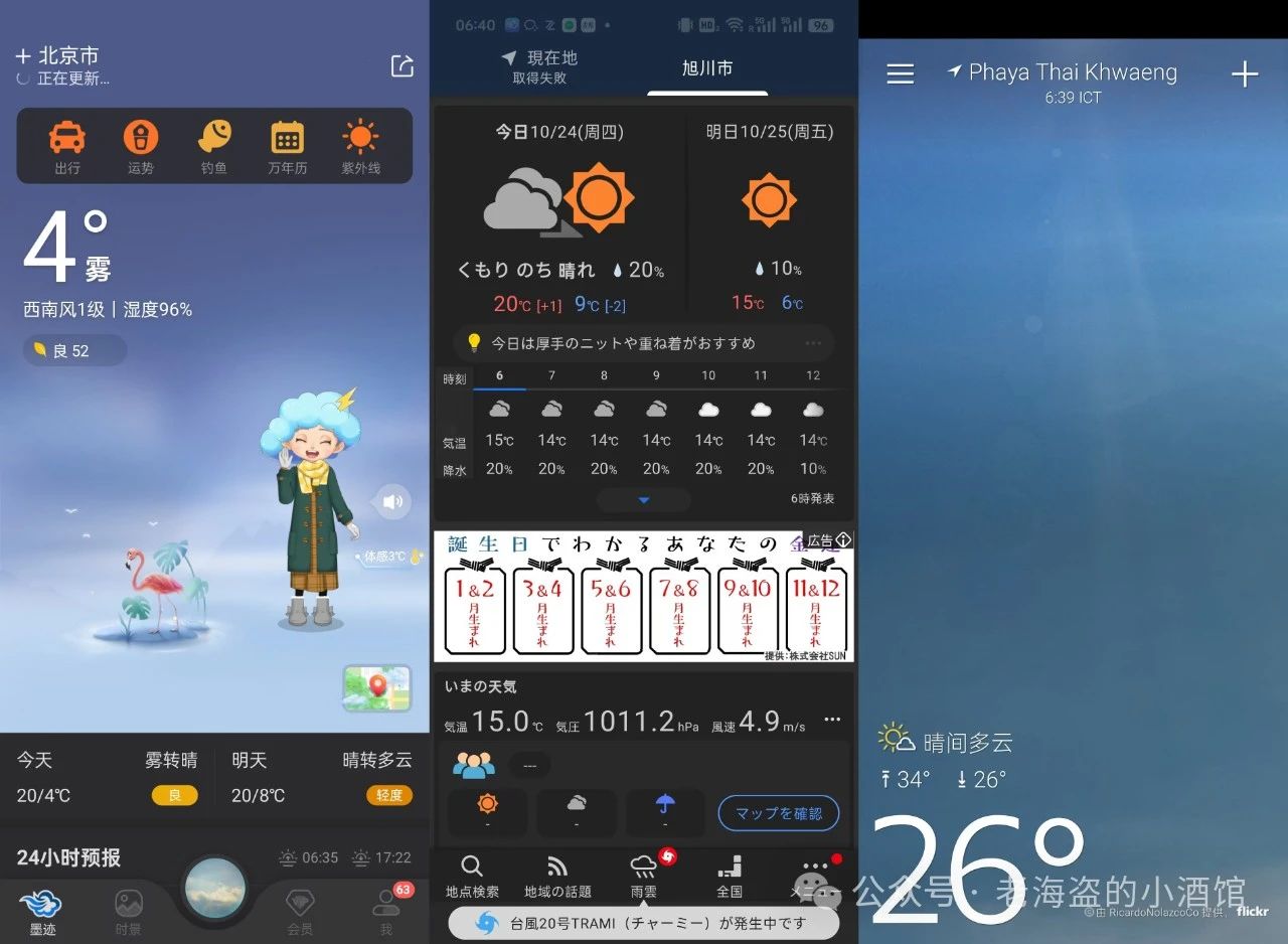 图片上从左到右依次是墨迹天气,雅虎天气日本版,雅虎天气国际版。