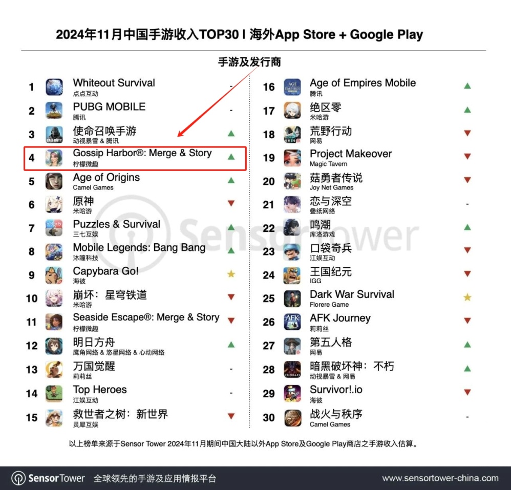 这两天,Sensor Tower 公布了 2024 年 11 月中国手游海外收入 Top 30,其中最值得注意的是柠檬微趣旗下 Merge-2 手游「Gossip Harbor」排名首次超过「原神」,上升至畅销榜 Top 4,刷新历史最高排名。「Gossip Harbor」的当月流水也超过了 Moon Active 旗下的「Travel Town」,成为全球月流水最高的合成类游戏。