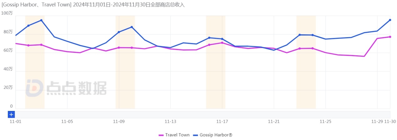 「Gossip Harbor」(蓝色)在 11 月内绝大部分时间的海外日流水均已超过「Travel Town」 | 数据来源:点点数据