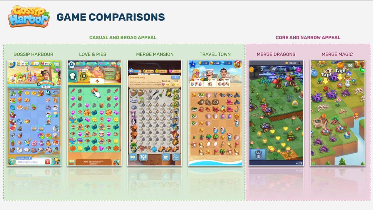 「Gossip Harbor」和「Love & Pies」类似,都选择了受众面更广的休闲定位(绿色) | 图片来源:DoF