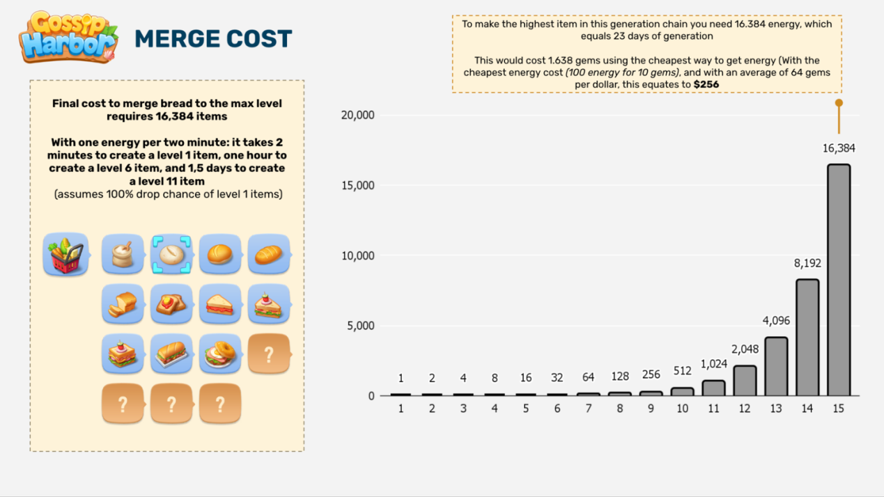 想要完成订单,玩家往往需要生成器(Generator)来生成相关物品,再合成出订单需要的指定物品。生成物品需要消耗游戏里的另一种资源“能量(Energy)”,如果能量耗尽玩家就需要等待一段时间,或者花费另一种游戏内货币“宝石(Gem,唯一能直接内购的货币)”来恢复,也是同类产品常见的操作。
