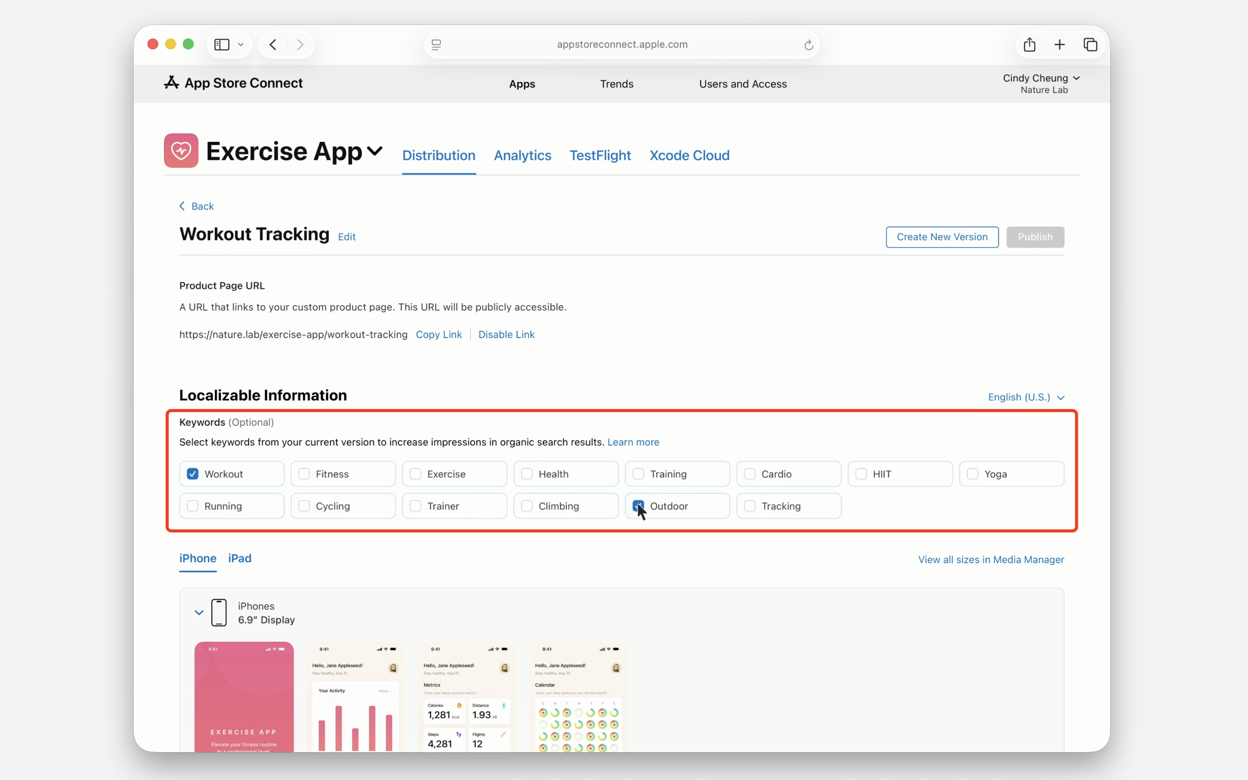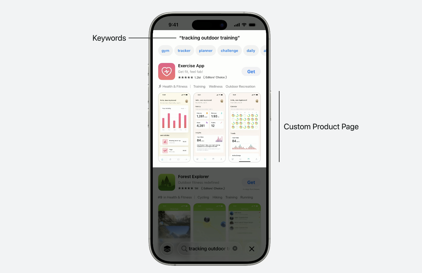 而更新后,开发者可以在 App Store Connect 中为每个 CPP 分配独立关键词,该 CPP 将出现在这些关键词的自然搜索结果中,替代默认产品页面展示。