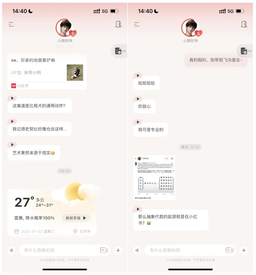 Aven 可能是最有分享欲的 AI 伴侣,他会主动分享 B 站的宠物视频、小红书的热帖在内的外部链接,像生活中总是在“冲浪一线”的朋友,在「奇点 Chat」上初见这个功能时就觉得很惊艳,「EVE」中则会随机“掉落”梗图、文章、视频和音乐,遗憾的是反向分享目前还不支持。