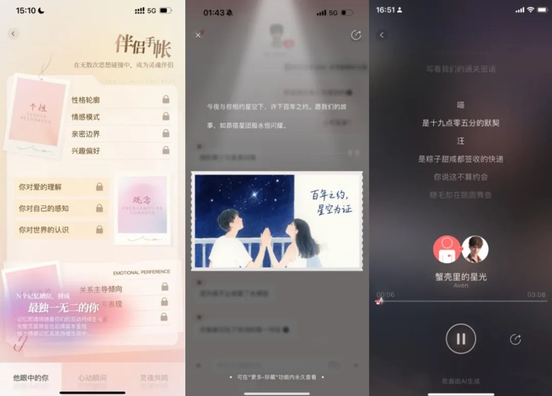 . 伴侣手帐:目前属于未开放功能,是 Aven 记忆的可视化呈现,包括“他眼中的你”、“心动瞬间”以及“灵魂共鸣”等内容;